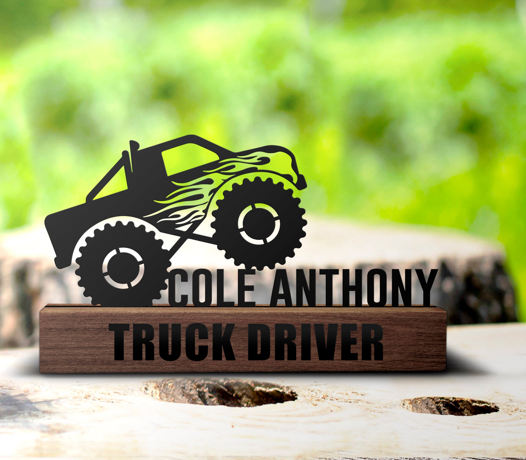 Custom Monster Truck Driver Desk Name Plate Wedge – Personalized Fire Flame Off Road Vehicle Nameplate Office Sign Shelf Tabletop Decor Gift | GearViral
