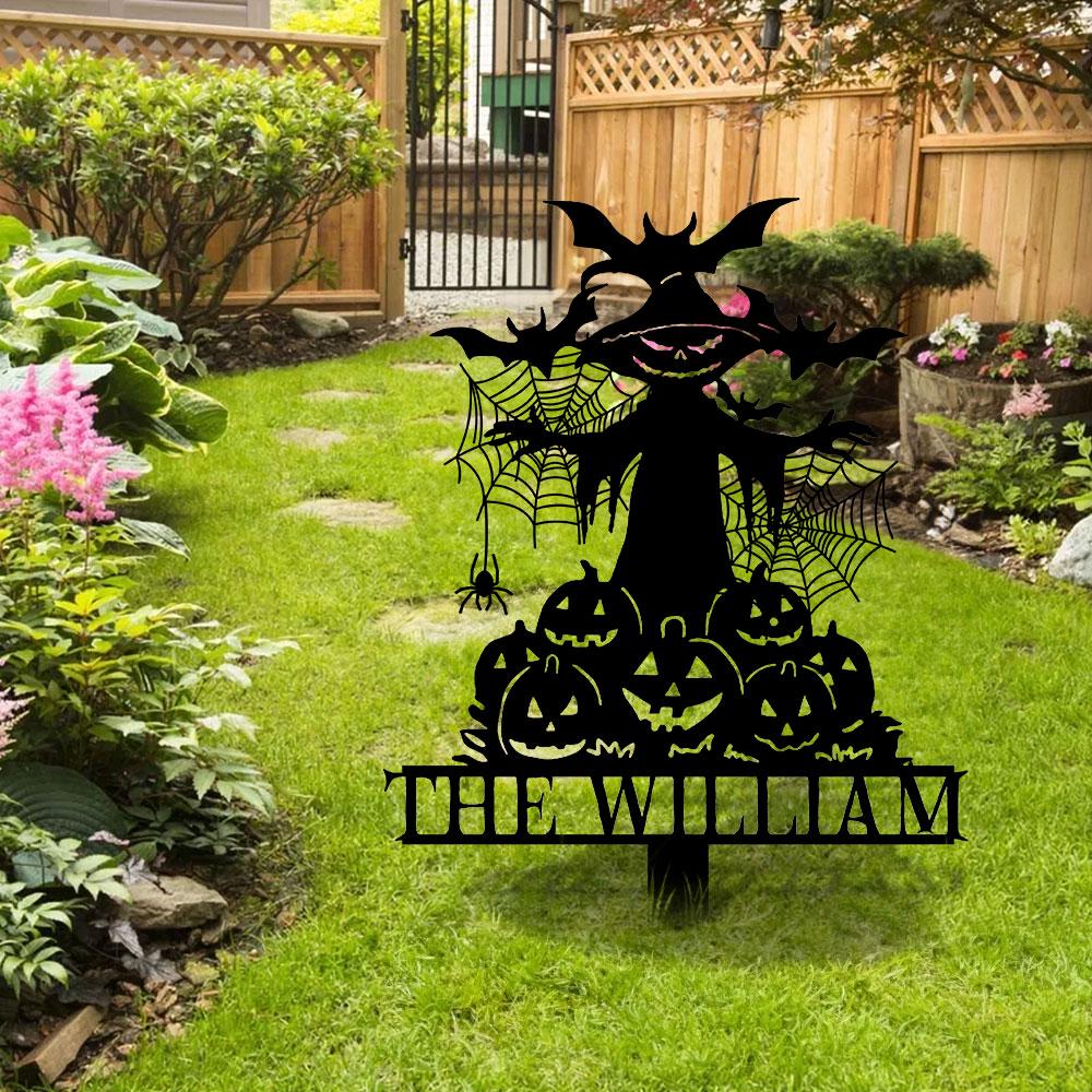 Metal Sign Witch and Pumpkin Halloween, Custom Name Metal Stake,Personalized Family Yard Sign, Outdoor Door Garden Decor, Garden Lovers