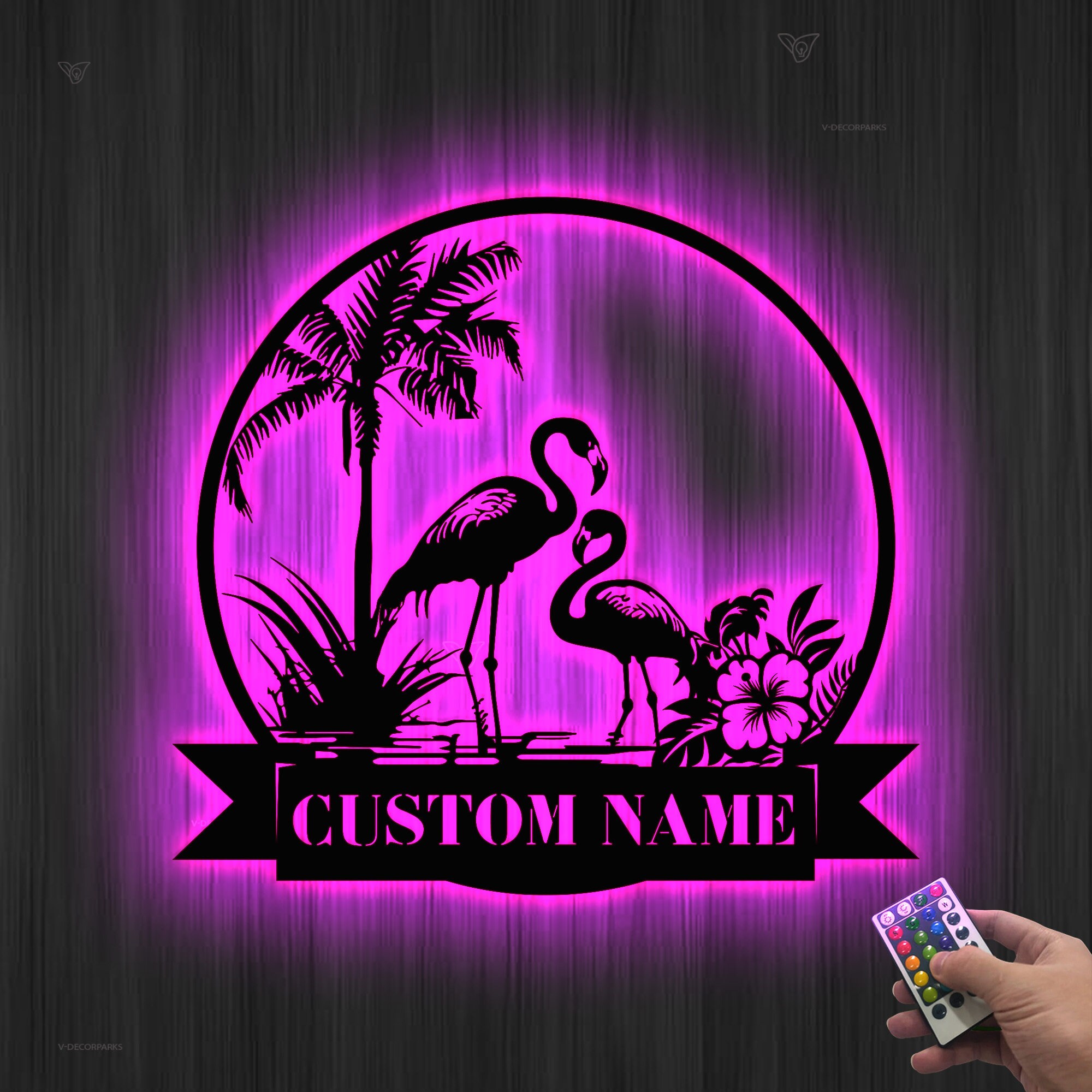 Personalized Couple Flamingo Metal Wall Art LED Lights Custom Pink Flamingo Name Sign Home Decor Nursery Decoration Birthday Housewarming | GearViral