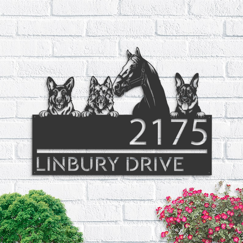 Personalized German Shepherd Dogs And Horse Metal Address Sign House Number Hanging Address Plaque Yard Sign Outdoor Decor | GearViral